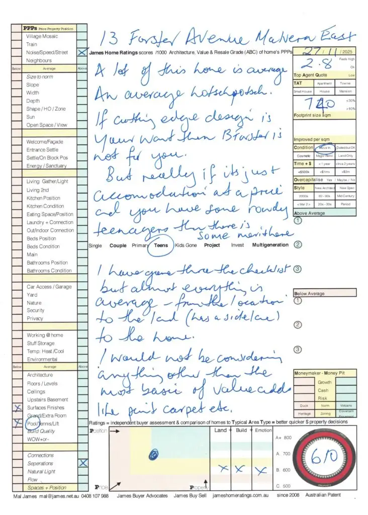 James Home Ratings is a 25 year old, patented, 1500 buy/sells plus 1,000-point scoring system based on the 3 critical drivers of long-term property value: