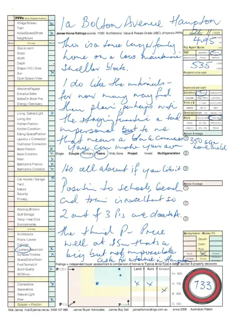 Inside, the home feels a little plain and unemotional right now, but that is largely the staging. In reality it is a blank canvas where you can bring your own furniture and personality. I rated it 733 out of 1000 which is a strong result. Position is a real plus with good access to schools, beach and train, so two of the three Ps of Price Property Position are close to an A and the third is the one we test on auction day. This works for primary age children, teens and even multigenerational living with that downstairs suite.