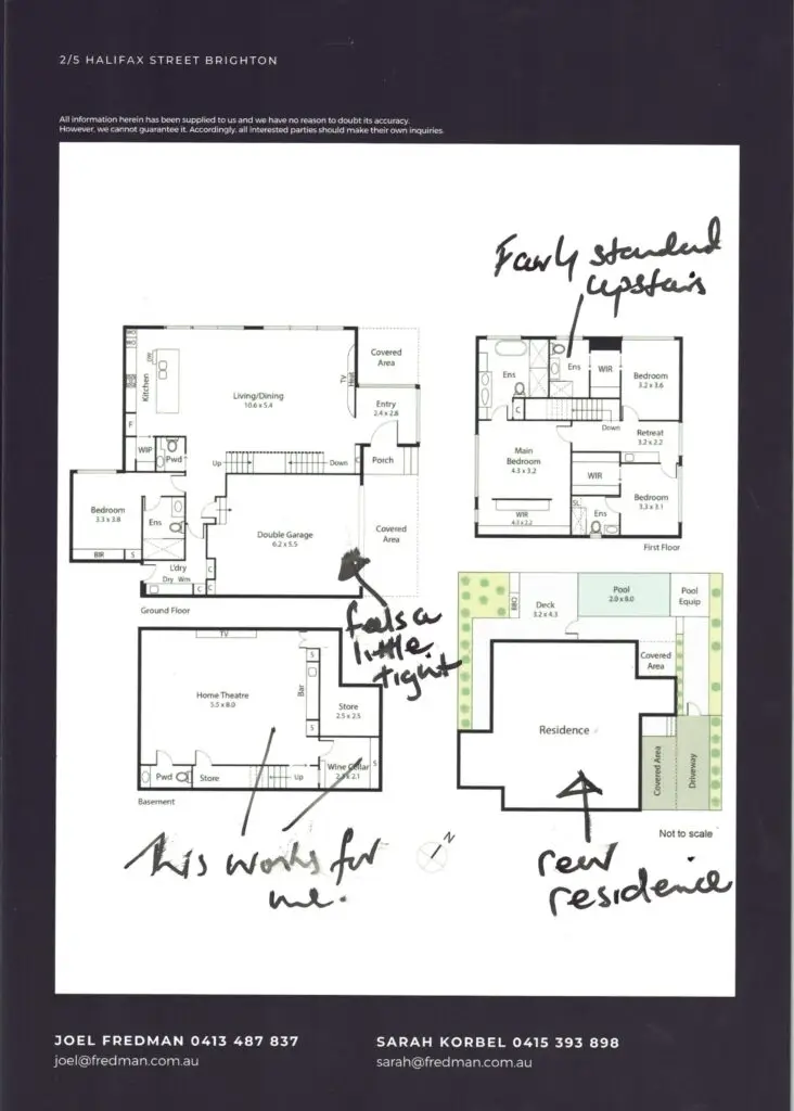 Property. Three levels, 4 beds (one down), basement cinema/cellar that works if you’ll use it. Open-plan living to pool—fun, but it trades away yard. No lift and lots of stairs narrows the future buyer pool. Façade/entry feel a little tight; upstairs is fairly standard. Mostly cosmetic upside.