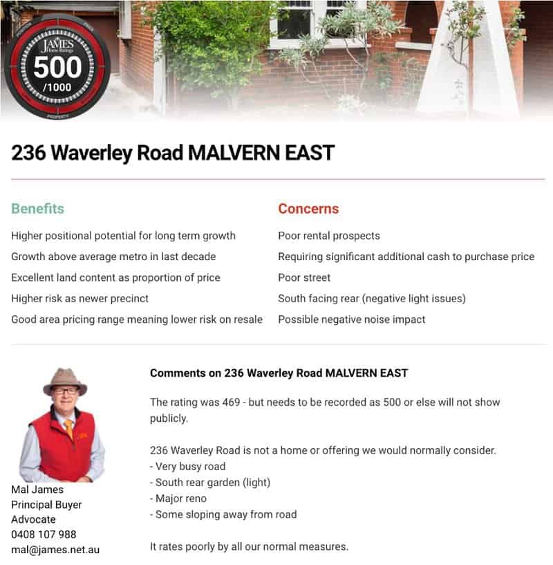 Auction Report: 236 Waverley Malvern East (John Chartres). Quote was $1.7m to $1.8m. This was disappointing to miss what normally we would not go after. This was a very good buy for the eventual winner at $1.97m. This has the bones for a really good investment. Yes, we know all the negatives – but this is a money spinner with the right reno. Volcano (4) bidding and accurately quoted by John – good agent work. Well done buyer – smart!